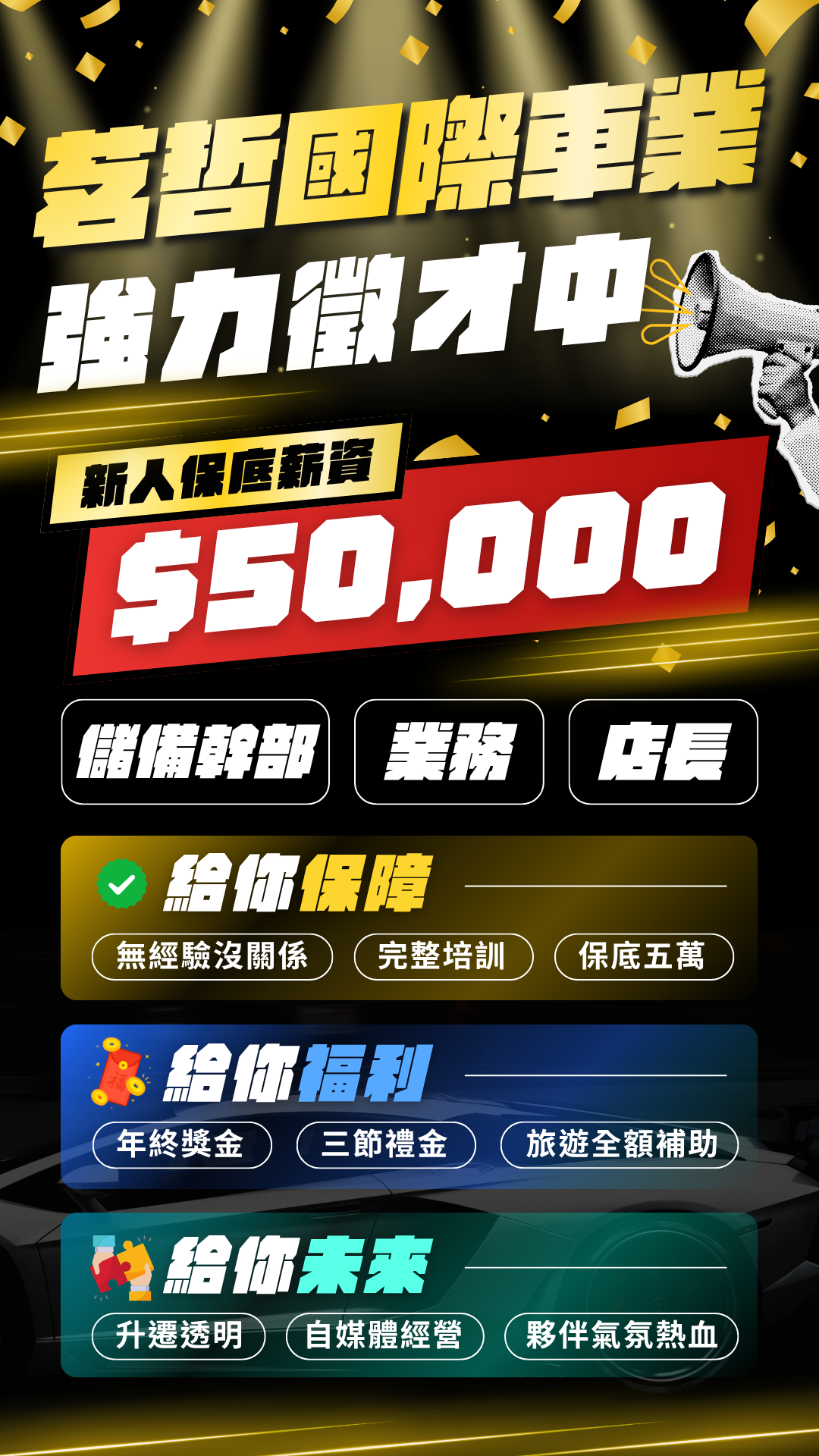 年終獎金、三節禮金、季獎金、業界最高抽成、勞健保、購車福利、員工制服、電腦設備、自媒體拍攝設備、專人手把手教學、停車位、出國全額補助、免費國內旅遊、每月免費聚餐