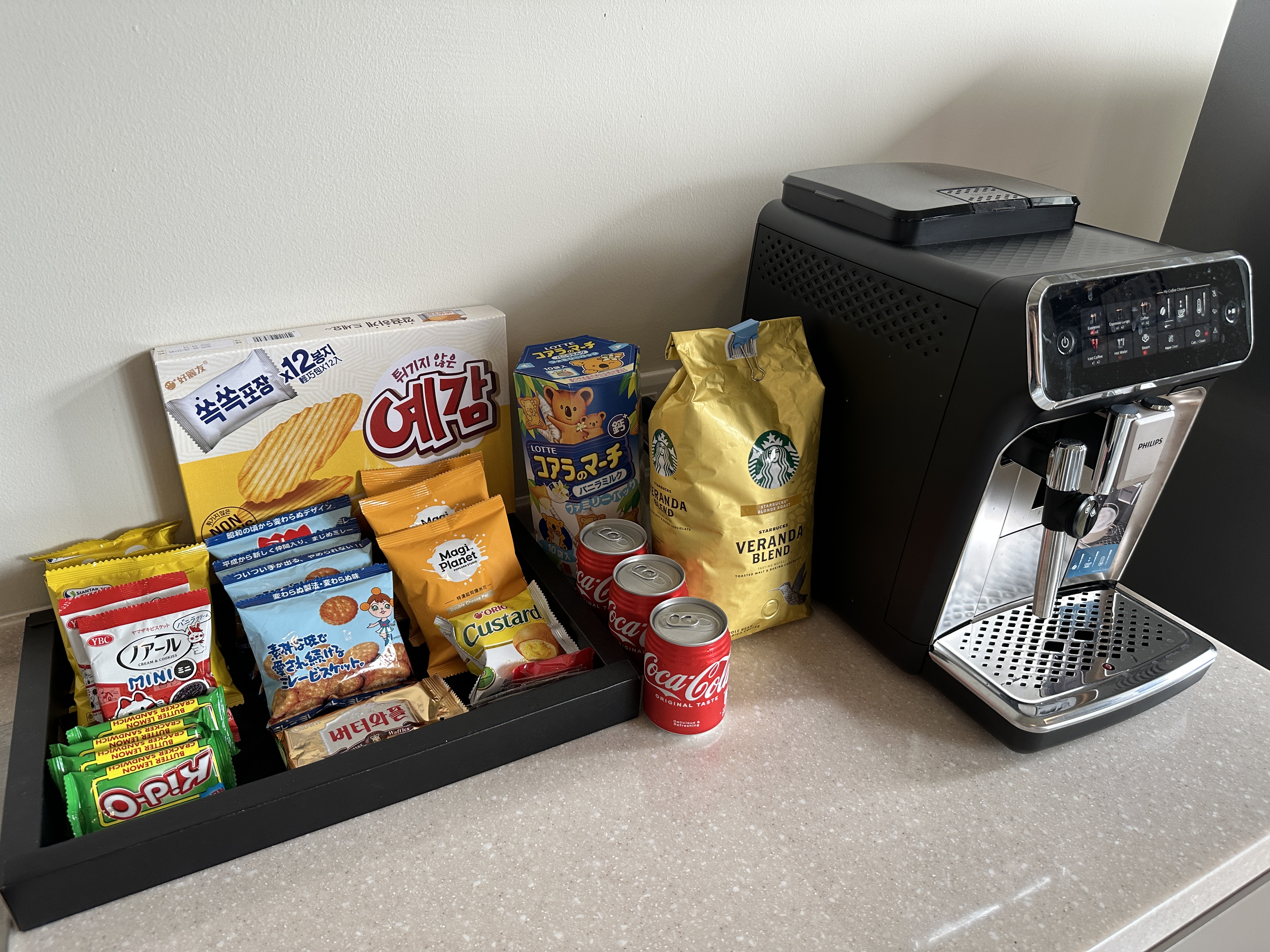 ◇ Espresso machine with coffee beans, creamer & sugar, fridge, microwave, snack bar, and water dispenser